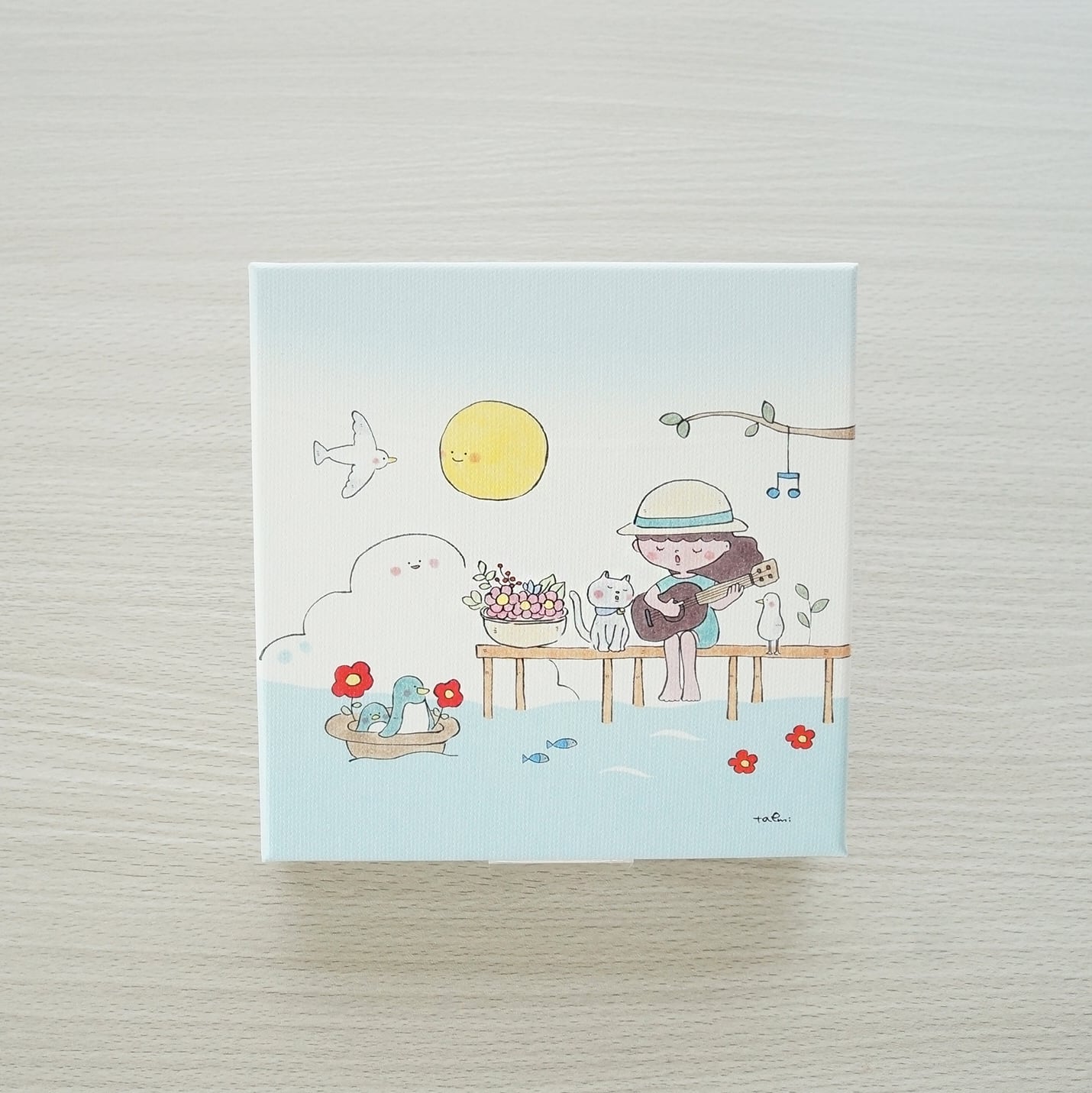 桟橋でウクレレを弾く女の子。心地よい海風とともに穏やかな時間が流れる作品です。